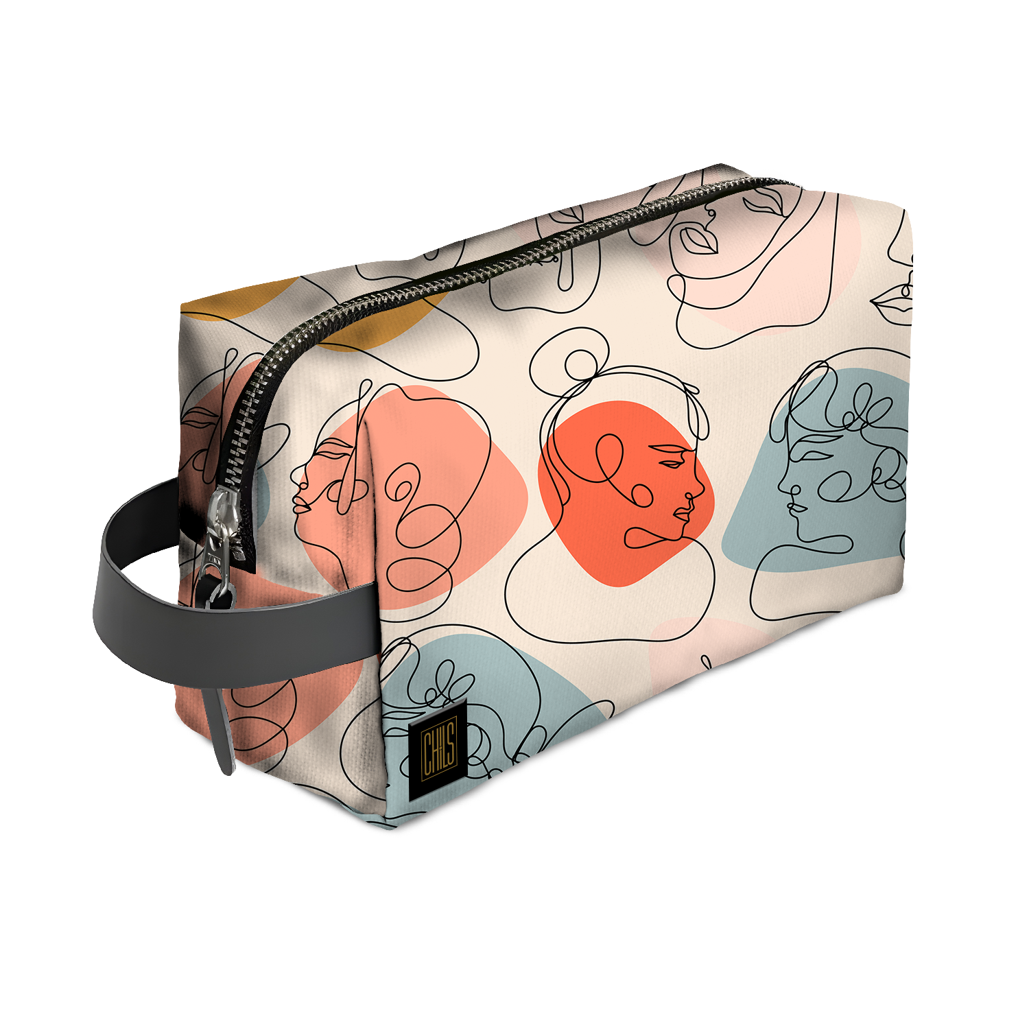 Motif all-over de visages colorés sur fond blanc. Toile ou velours, pratique et fun, pour vos essentiels.